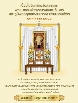 13 ตุลาคม 2565 13 ตุลาคม 2565 เนื่องในวันคล้ายวันสวรรคตพระบาทสมเด็จพระบรมชนกาธิเบศร มหาภูมิพลอดุลยเด